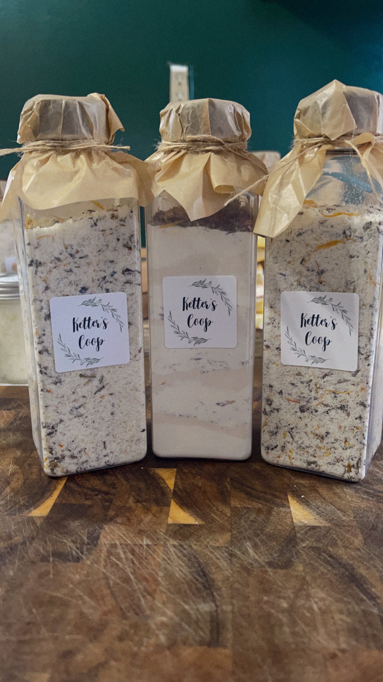 - epsom salt- natural way to sooth and heal dry skin, built with magnesium which helps maintains the moisture levels in your skin so it helps keep it hydrated. Also has anti inflammatory properties.